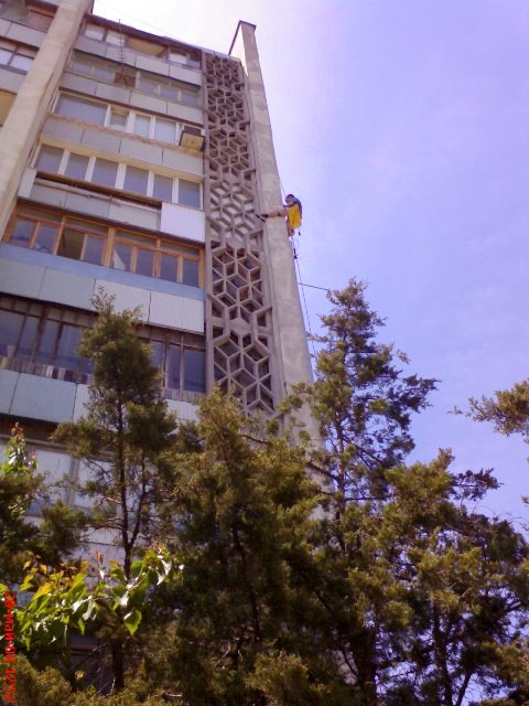 ЕвпаторияВ жизни, говорят, всегда найдется место  подвигу.  И что интересно, для того, чтобы его совершить, надо всего лишь в нужное время оказаться в нужном месте. Желательно с фотоаппаратом или мобильником в руках, чтобы этот подвиг кто-нибудь запечатлел для истории, телевидения или для врача «Скорой помощи». Им ведь тоже интересно посмотреть, когда у безголового  пациента оторвалась голова и как ему удалось ее восстановить на прежнее место без ниток и скальпеля. Но это, конечно, шутка неудачная, насчет головы оторванной. Такого и я не видел. Да и не об этом сейчас речь. Я подводку писал к другому, к новой рубрике сайта "Крымский аналитик", которую мы решили назвать простенько, но со вкусом; "Фотоохота на улицах Евпатории". Только не надо ни в кого газами стрелять из пистолетов и из дробовиков свинец распылять. Эта охота исключительно для мобильников: достал, щелкнул и побежал. Почему побежал, а вы попробуйте милиционера сфотографировать во время ДТП или пьяного водилу, который только что куда-то не совсем удачно въехал и тогда поймете мою инструкция правильно. Так вот, иду я, значит,  сегодня по проспекту Победы в  Евпатории, никого не трогаю и вдруг вижу на девятиэтажном доме, прямо над переговорным пунктом, мужик завис на веревках. Похоже, квартирку уже присмотрел, еще секунда и влезет в окно незваным гостем.