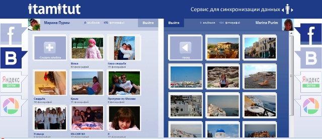 С помощью itamitut.ru вы сможете перенести информацию из «ВКонтакте», Picasa, Яндекс.Фоток в Facebook и обратно.  Для этого нужно авторизоваться на тех социальных площадках, с которыми вы собираетесь работать. Вы увидите экран, разделенный на две части: с одной стороны одна соцсеть, с другой стороны — другая. Я, например, ощутимо больше времени провожу на Facebook, поэтому чаще что-то новое публикую именно там. Но и аудитория там у меня широкая, большинство людей — коллеги по работе. «ВКонтакте» для меня — место встречи с однокурсниками и друзьями. Там я бываю гораздо реже, но именно там я выкладываю фотки дочки и прочее личное. Чтобы потестировать сервис, я взяла альбом из отпуска в Греции, который давно опубликовала на Facebook, но так и не собралась сделать это «ВКонтакте». Перед тем, как перетаскивать альбом, можно, конечно, посмотреть, что в нем есть. Если все устраивает, вы просто перетаскиваете альбом в другое окно. Проверяем: открываем «ВКонтакте» и смотрим новости — мои фотографии уже там. Перенос занял меньше минуты (представьте, сколько времени у меня бы ушло на новую загрузку 21 снимка?). Сразу зайдите в настройки альбома и выберите, кому вы хотите дать доступ, по умолчанию он будет открыт всем.
