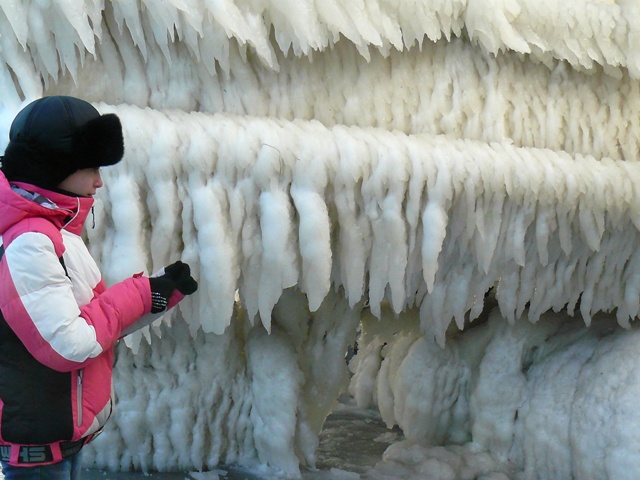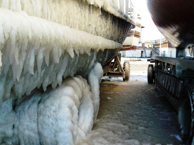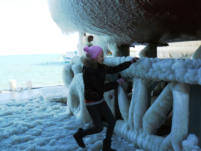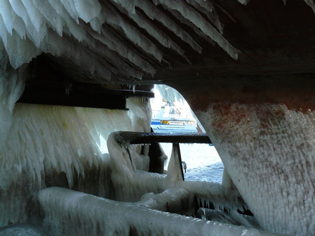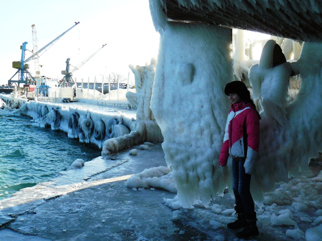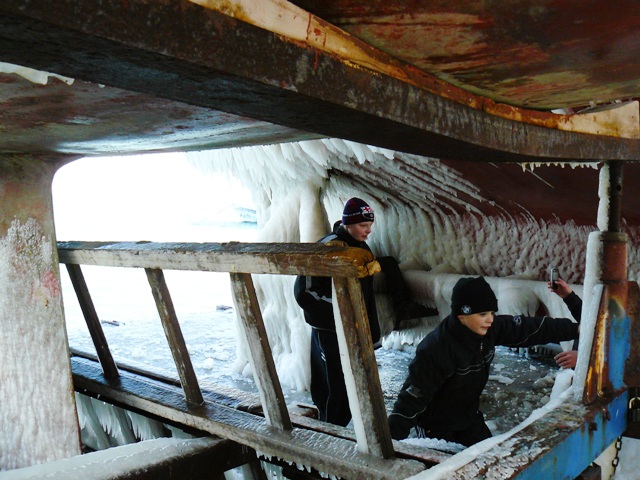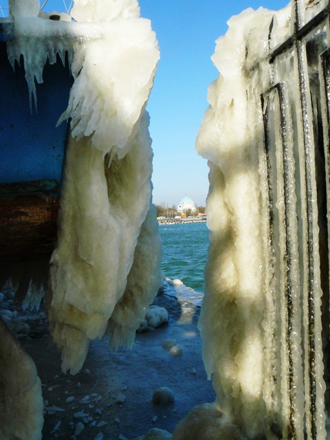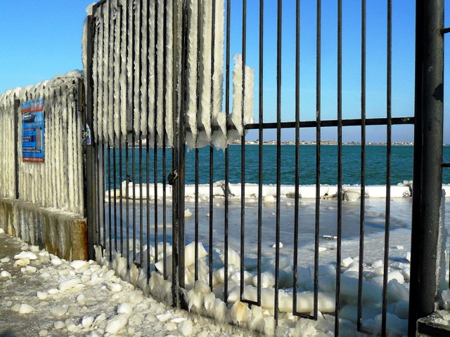 В Евпатории море вышло из берегов и заморозило яхты и причалы соленым льдом.  Море у Евпатории не замерзло. Соленым льдом покрылись набережная, яхты и причалы. В субботу в Евпатории стих штормовой северо-восточный ветер, ему на смену пришел десятиградусный мороз. Крымский папарацци решил ознакомиться с последствиями шторма и отправился на набережную Терешковой. По дороге к морю особых разрушений не обнаружил. Обрубленные коммунальщиками стволы деревьев устояли, на провода и автомашины не падали, людей не убивали. Во всяком случае, улица Гагарина на этот раз не пострадала. Несколько месяцев назад штормовой ветер оставил жителей улицы Гагарина без света на несколько дней. Не было в городе и перебоев с отоплением в многоэтажках, а первый микрорайон осчастливили даже горячей водой в кранах. Но самое красивое зрелище можно было наблюдать на набережной Терешковой. Морская вода покрыла толстым слоем льда яхты, набережную, причалы и стены кафе «На семи ветрах». Посмотреть на соленый лед в субботу потянулись не только школьники, но и взрослые. Фотосъемка под днищем яхты – новое увлечение евпаторийцев. Крымский папарацци сделал несколько снимков на память и даже попробовал лед на вкус. Соленый до неприличия. А тем, кому лень было ходить по льду и пробовать его на вкус – остается смотреть на зимний пейзаж глазами крымского папарацци.