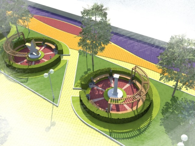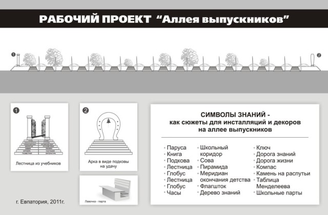 Конечно, аллея – это не только деревья. Управление архитектуры предлагает разместить там ряд беседок с лавочками, в центре которых установить декоративные символы поколений:  книгу, калькулятор, мобильный телефон, телевизор. Что взять за временную точку отсчета: начало прошлого века, Великую Отечественную войну либо какое-то другое событие, - решать евпаторийцам.  Другое предложение (его озвучила на оргкомитете дизайнер Илона Клочкова) – взять за основу концепции не временной, а символический подход. Установить арку знаний, через которую выпускник выходит во взрослую жизнь. Сделать ступеньки с надписями школьных предметов, поставить рядом скамейки-парты.