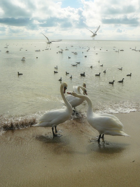 Евпатория. Море. ЛебедиЕвпатория приходит в себя после искусственной засухи. Тонкая струйка воды в кранах,  в субботу стала намного толще, но пока это мало кого радует. Вода из кранов идет желтая с резким запахом хлора. Водоканал продолжает промывать и дезинфицировать  трубы, а врачи местной СЭС советуют для питья и приготовления пищи использовать очищенную воду из магазина. В городе продолжает действовать запрет на подогрев воды. Горячей воды в Евпатории не было уже неделю, но это не самое страшное. В субботу можно забить на бытовые проблемы, взять с собой детей и отправиться к морю, кормить птиц. Оголодавшие лебеди и утки ждут вашей помощи в парке Фрунзе и на набережной имени Терешковой. Кроме птиц, кормиться к морю в парк имени Фрунзе приходят бездомные собаки, которые подхватывают не долетевшие до воды  куски хлеба. Собаки, проявив голодную сообразительность, внимательно следят за детьми, которые не могут добросить хлеб до воды. Вертятся у них под ногами и в воздухе пытаются перехватить чужой гостинец. Эти картинки евпаторийской жизни у моря пытаются запечатлеть десятки фотолюбителей.  Уже сегодня в социальных сетях можно часами рассматривать евпаторийскую «лебединую песню» в исполнении любителей и профессионалов. Так, что господа-товарищи, присоединяйтесь. Лебеди, утки и собаки на берегу моря ждут вас с хлебом и солью. Последний атрибут необязателен. «Посолить» хлеб лебеди могут без особых проблем  и сами,  морской водой.