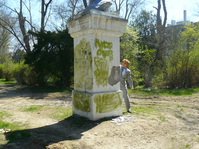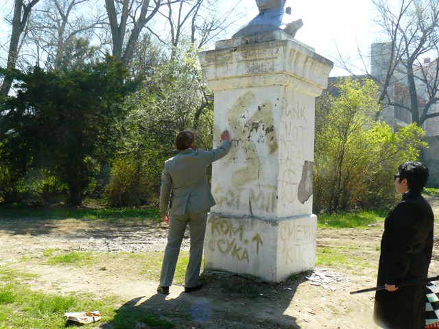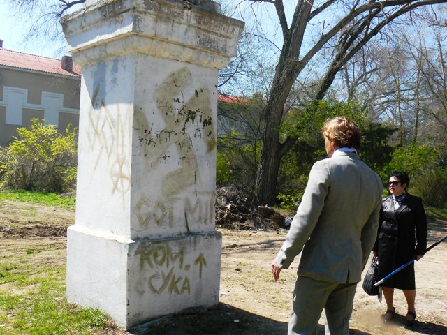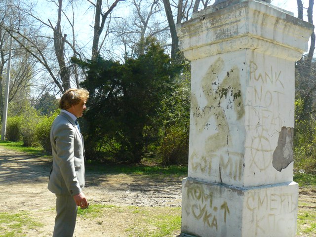Геннадий Бондаренко в ЕвпаторииСкандал, связанный с появлением на постаменте памятника Кирову фашистской свастики, получил вполне логичное для Евпатории продолжение. После митинга у памятника Ленину во время, которого депутат Евпаторийского горсовета Марк Пурим рассказал об акте вандализма, первый секретарь горкома компартии Украины Геннадий Бондаренко вместе с народным избранником,  отправился к памятнику Кирову.   Оскверненный вандалами памятник никого из правоохранителей не заинтересовал. Напомним, что на митинге присутствовали сотрудник СБУ в штатском и  два милиционера в форме. Никак не отреагировали правоохранители и на публикацию о ЧП городского масштаба на сайте «Крымский аналитик». Депутат Евпаторийского горсовета Марк Пурим по телефону сообщил о совершенном акте вандализма заместителю городского головы Эдуарду Кугелю, а первый секретарь горкома Геннадий Бондаренко попытался стереть свастику с постамента. Однако сделать это подручными средствами ему не удалось, и чтобы хоть как-то скрыть свастику, он затер ее зеленой травой. После чего постамент памятника великому революционеру Кирову приобрел весьма экстравагантный облик. Но, учитывая, что в воскресенье коммунальные службы города, как и весь украинский народ отдыхают от трудов праведных, приведения в порядок памятник решили перенести на понедельник.