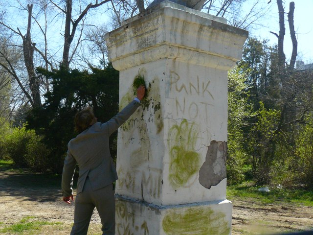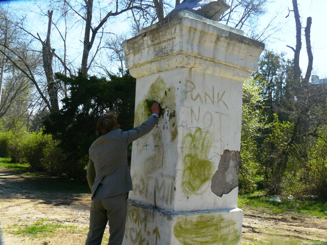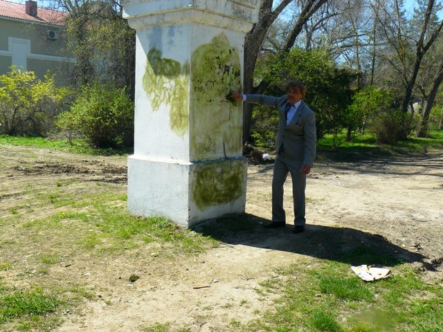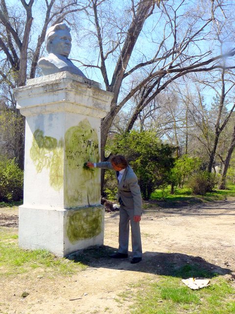 Первый секретарь Евпаторийского горкома Коммунистической партии Украины Геннадий Бондаренко закрасил  фашистскую свастику на постаменте памятника Кирова … зеленой травой.