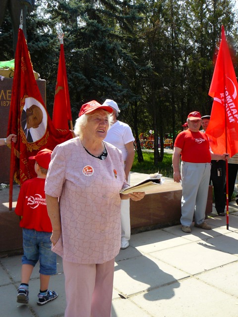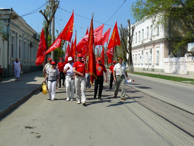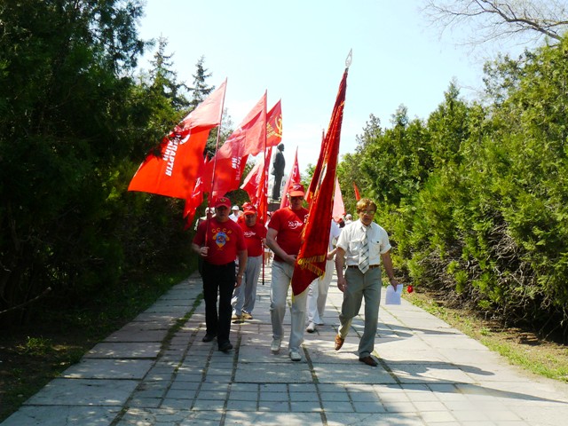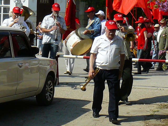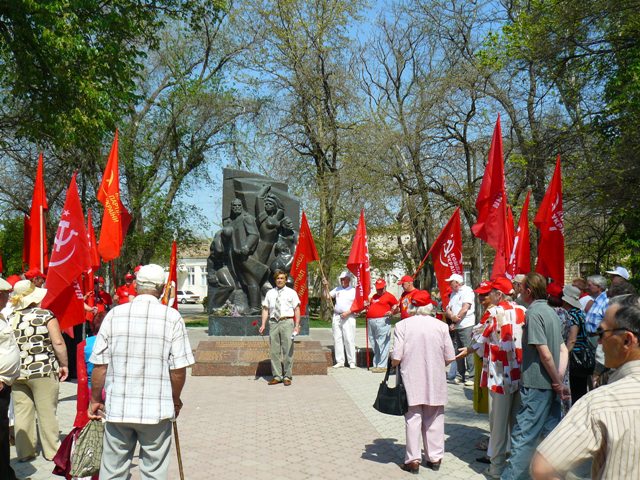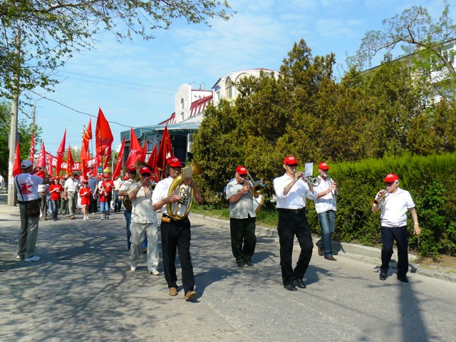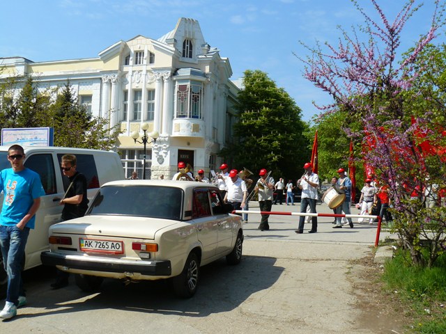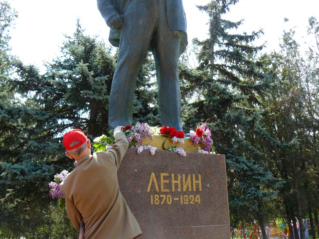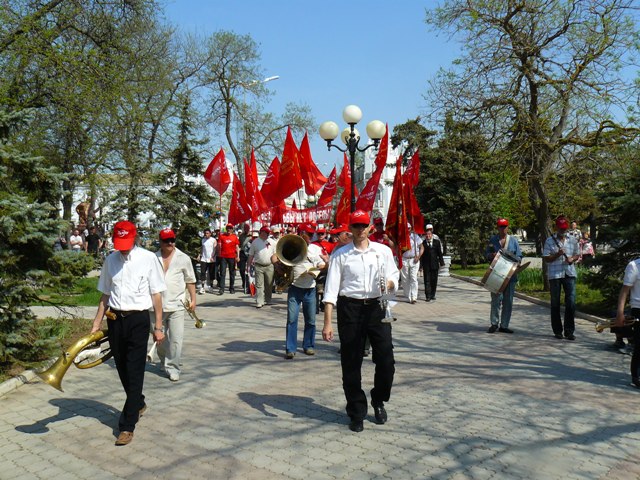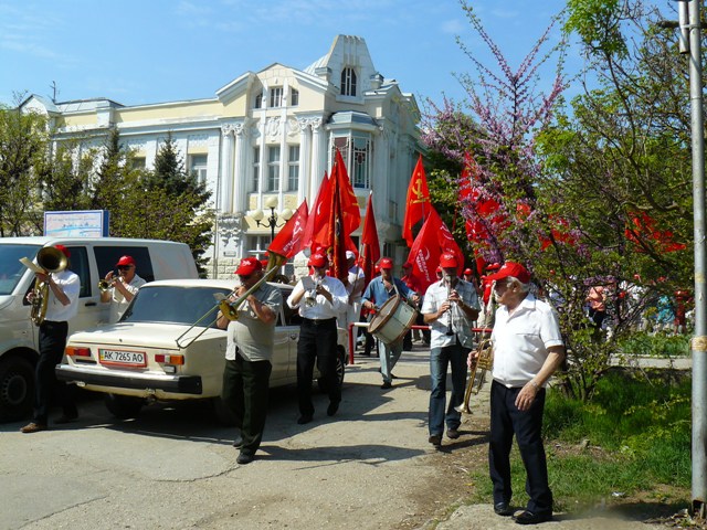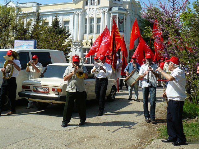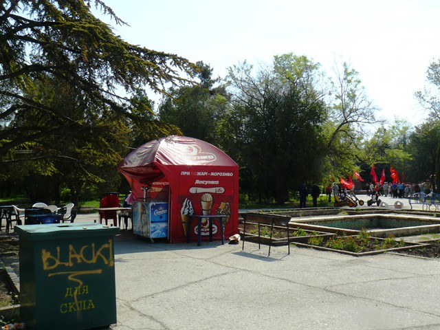 Фото. В Евпатории дорогу к памятнику Ленину демонстрантам перекрыли торговой палаткой и автомашинами.  Честно говорю, я собирался писать праздничный репортаж о Первомайской демонстрации трудящихся, которую в городе курорте по традиции проводили члены Коммунистической партии Украины. Руководство городской организации компартии своевременно подало заявку в исполком. Праздничную колонну возглавлял духовой оркестр под управлением заслуженного работника культуры Михаила Пиастро. Колонна была украшена красными знаменами и коммунистическими лозунгами. А чтобы чего не вышло, демонстрантов сопровождали сотрудники ГАИ и милиции. Проблемы у демонстрантов возникли на театральной площади, когда сотрудник исполкома, предложила изменить привычный маршрут. Дело в том, что на главной аллее Ленинского сквера, которая ведет к памятнику Ленину, местные предприниматели установили питейное заведение. И что интересно, питейная точка умудрилась полностью перекрыть дорогу к памятнику. Демонстранты стали возмущаться, столь бесцеремонными действиями местных бизнесменов, но освобождать дорогу и идти на штурм «Зимнего» не рискнули. Следуя указаниям сотрудника исполкома, колонна свернула на улицу Дувановскую и натолкнулась на перекрытый двумя автомобилями и металлической оградой путь к памятнику. Первыми сквозь узкую щель протиснулись музыканты, следом за ними – знаменосцы и все участники демонстрации, большинство из которых составляли пожилые люди, ветераны труда, участники войны. Понятно, что наплевательское отношение к людям, вызвало вполне адекватную реакцию. Я, как депутат Евпаторийского городского Совета вынужден был извиниться перед убеленными сединами ветеранами. Но объяснить, почему такое могло случиться в Евпатории – я не смог.