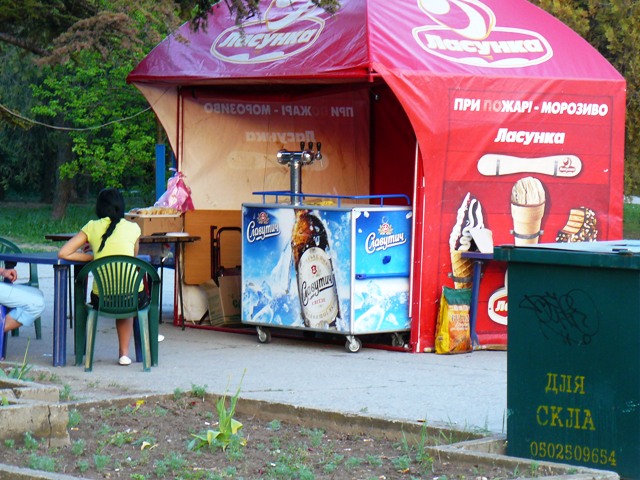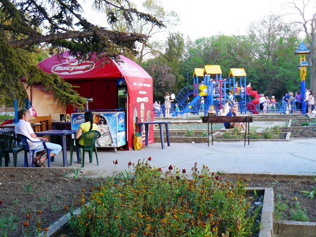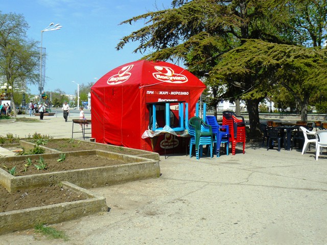 Для того, чтобы выдать героям этой истории заслуженные награды, прошу архитекторов и крупных специалистов в области выносной торговли, сообщить депутату Евпаторийского горсовета о том, кто и на основании каких документов разрешил питейным заведением перекрыть проход по центральной аллеи сквера имени Ленина? Мне так же хотелось бы опубликовать весь разрешенный для торговли в этом месте ассортимент товаров. Какие сорта вина, пива и водки могут реализовать в пяти метрах от детской площадки господа бизнесмены?