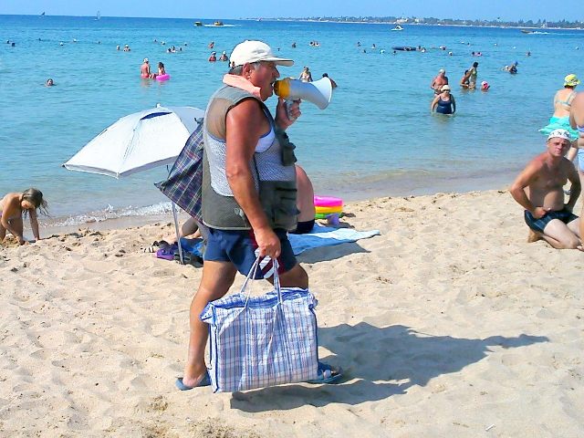 Пляжная торговля в ЕвпаторииВ Сети и в местной прессе то и дело появляются заметки о том, как на курортах Крыма успешно борются с незаконной торговлей на пляжах. Милиция рапортует цифрами и процентами, министр курортов Александр Лиев рассказывает о проведенных рейдах и проверках. Он даже кому-то грозит, и кого-то ставит в пример. Но все это пустые хлопоты, потому что пляжная торговля «домашними пирожками» хорошо налаженный бизнес, в котором участвуют сотни людей. Одни в неприспособленных сараях жарят и варят из второсортного сырья, то, что потом называют «сладкими трубочками с кремом», самсой, пирожками с яблоками, картошкой, капустой. Другие по утрам вывозят «домашние пирожки» на точки, где огромные сумки взваливают на свои плечи черные от загара торговцы запрещенным товаром. Сразу скажу:  труд этот, пожалуй, самый тяжелый  и неуважаемый в Крыму. Попробуй, походи с тяжеленной сумкой в сорокоградусную жару по пляжу, и не просто походи, но и уговори купить эти весьма сомнительные пирожки отдыхающих. Евпаторийских бизнесменов спасают от голодной смерти хуторские ребята из западной Украины. Только что рядом с тобой неслась на весь пляж «соловьиная мова», как с появлением торговки, тут же представитель титульной нации переходит на русский, чтобы приобрести «свежайшие домашние пирожки». – Москвичи  ничего не берут, - жалуется одна торговка другой. – Нос воротят. Зажрались.