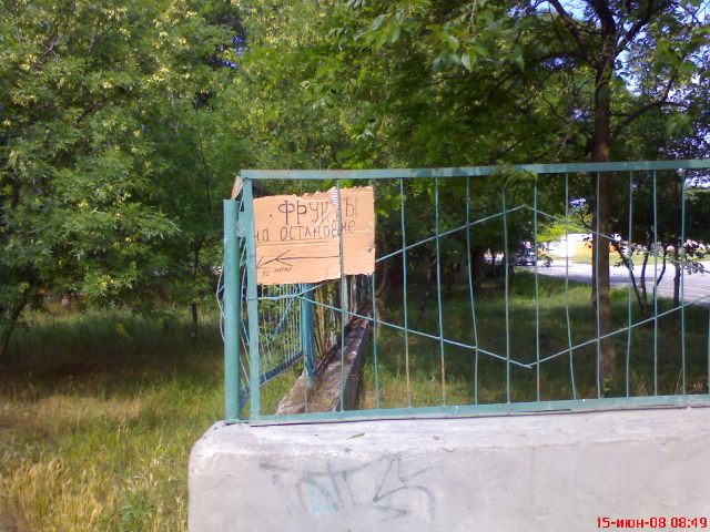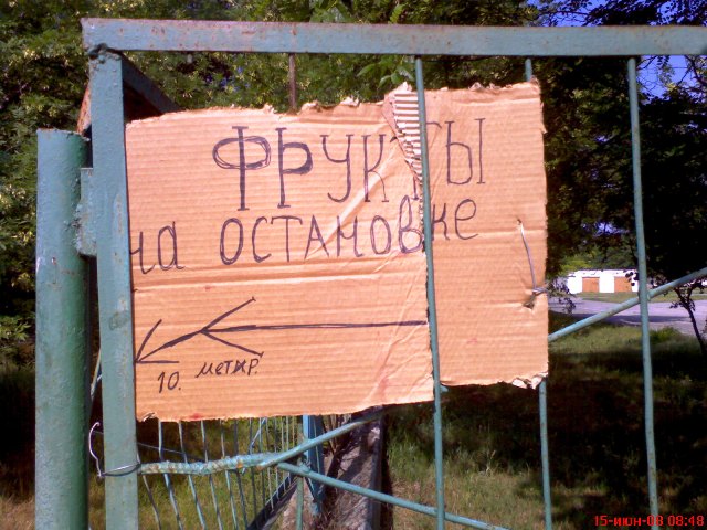Отправляясь на курорт, многие мечтают поправить свое здоровье и сбросить лишний вес. Проще всего эти два процесса совместить в Евпатории, если на время отказаться от маршруток и ходить к морю пешком. Сделать это намного проще тем, кто поселился в районе грязелечебницы «Мойнаки». На пляж отправляться лучше с семи утра. Врачи утверждают, что самый лучший загар в Евпатории можно приобрести до 11 утра и после 16, а в самое пекло лучше сидеть в баре или прятаться от солнечных ожогов в своем номере. Крымский папарацци последовал мудрому совету евпаторийских докторов и рано утром отправился пешком к морю сжигать лишний жир, наслаждаться природой и, конечно же, фотографировать все, что скрыто. Первый фотообъект ему попался на глаза в сотне метров от знаменитой на весь мир грязелечебницы "Мойнаки". На железный забор неизвестный автор прикрепил рукописное объявление, которое извещало потенциальных покупателей о том, что «Фрукты на остановке. 10 метр».