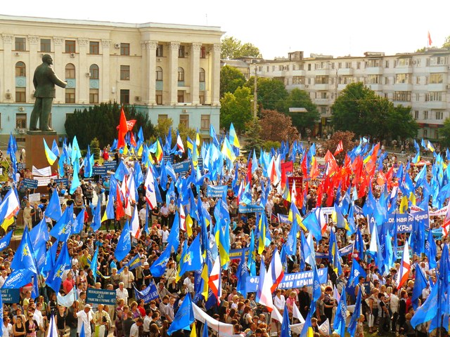 митингВ Симферополе в рамках Всеукраинской Вахты Памяти «Гордимся Великой Победой!» прошел масштабный антифашистский митинг. По оценкам правоохранителей, в нем приняло участие от 20 до 22 тыс. крымчан. К  месту проведения митинга на площади Ленина со всех районов города шли колонны крымчан, которые держали в руках транспаранты и плакаты с надписями: «Скажи «нет» неофашизму в Украине!», «Фашизм – чума 21 века!», «Бандеровцы и Шухевичи для нас не герои», «Гордимся Великой Победой над фашизмом!», «ВО «Свобода» – угроза миру в Украине!», «Крым не предаст памяти павших!», «Крымчане! Хватит терпеть, хватит молчать! Пора «тягнибоковцам» рот закрывать!», «Осторожно! Фашизм на «свободе» и прочие. В руках они несли государственные и крымские флаги, а также символику Партии регионов, КПУ, партии «Русское единство», профсоюзных и общественных организаций. Одну из колонн, которая шествовала со стороны Центрального рынка, венчало огромное красное боевое знамя.