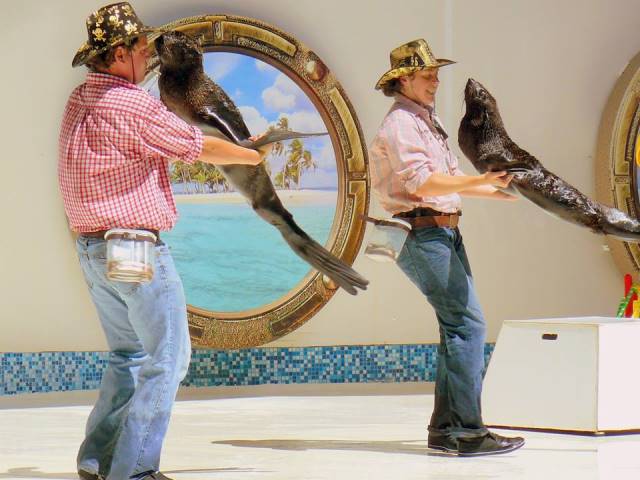 Коллектив дельфинария представил зрителям новую программу «Морской вояж» с участием дрессированных морских котиков, львов и дельфинов.