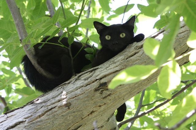Мы знали уже наверняка, каких котят следует ждать – черненьких. Удивительно, но благодаря Моське мы узнали о кошачьем постоянстве, а не ветрености, как принято думать. Моськин кавалер – черный красавец кот – появился в нашем дворе пять лет назад и влюбился в Моську с первого взгляда. Это взгляд я запечатлел на снимке. Бдительная овчарка Грея загнала влюбленного вздыхателя на орех, где тот в жутком страхе провел всю ночь.