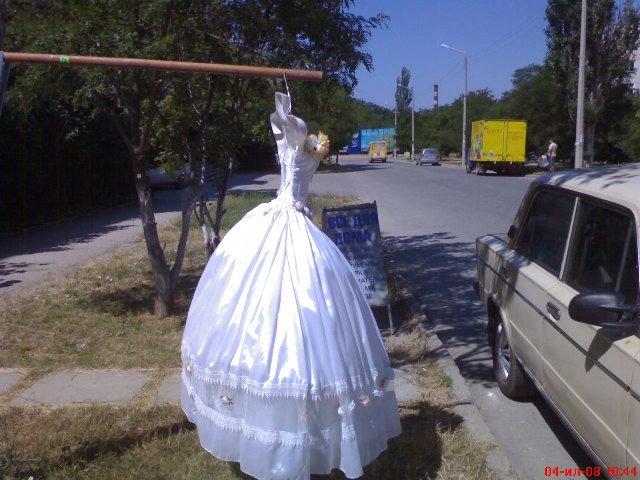 PS. На следующий день после появления в Сети этой заметки "Свадебный мир" решил поднять на более высокий уровень рекламную кампанию своего предприятия и вывесил у дороги белое платье невесты.  Теперь оно, вместе с рекламными текстами, украшает улицу Некрасова. Такого еще здесь не было.
