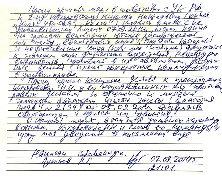 На фото заявление в полицию о хулиганстве Котляревского в полицию Евпатории.
