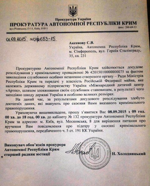 ПрокуратураСозданная в структуре генпрокуратуры Украины так называемая «прокуратура Автономной Республики Крым» просит главу Крыма Сергея Аксёнова явиться в это ведомство для решения вопроса о вручении подозрения по делу о хищении имущества Международного детского центра «Артек» и его передаче РФ. Текст письма имеется в распоряжении Крыминформа. В письме сказано, что так называемая «прокуратура АРК» в Киеве по результатам досудебного расследования дела по факту присвоения должностными лицами Совета министров имущества МДЦ «Артек» РК и его передачи в собственность Российской Федерации пришла к выводу о достаточности оснований по обвинению Аксёнова в уголовном преступлении – злоупотреблении служебным положением, что нанесло Украине ущерб в особо крупных размерах. В связи с этим украинский «и.о. прокурора АРК» Холодницкий просит Сергея Аксёнова явиться в это ведомство для «решения вопроса о вручении сообщения о подозрении в совершении уголовного правонарушения, предусмотренного ч. 5 ст. 191 УК Украины». При этом Холодницкий не поясняет, какую именно должность в структуре украинской власти занимал Аксёнов, превышая свои полномочия. Кроме того, письмо написано на бланке некой «прокуратуры Украины», хотя такого ведомства не существует.