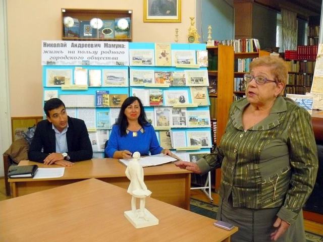 В Евпатории в библиотеке имени А. С. Пушкина состоялся «круглый стол», посвященный дню памяти Николая Мамуны – городского головы в период с 1886 по 1906 годы. В мероприятии приняли участие заместитель главы администрации города – начальник управления межнациональных отношений Эльмар Мамбетов, представители национально-культурных автономий города, общественность и школьники. В этом году исполняется 100 лет со дня смерти евпаторийского градоначальника конца XIX – начала XX века. «Николай Мамуна занимал должность городского головы Евпатории 20 лет и посвятил свою жизнь городу. Теперь наша задача: сохранить память о нем и передать ее подрастающему поколению», - отметил Эльмар Мамбетов. Он также пригласил всех желающих 30 октября прийти на торжественное открытие памятной доски градоначальнику. Ее установят на фасаде здания бывшей Евпаторийской городской управы на улице Караева, 4. На мероприятии присутствовал евпаторийский скульптор Василий Василюк, который создал макет будущего памятника Николаю Мамуне. Как рассказал Эльмар Мамбетов, место для его установки уже определено. Греческая община «Элефтерия» наиболее активно принимала участие в продвижении вопроса об установке мемориальной доски и памятника евпаторийскому городскому голове, который по своему происхождению был греком. Как подчеркнули выступающие, период, когда Николай Мамуна руководил городом, отмечен в истории Евпатории небывалым подъемом экономики, быстрым ростом населения, расцветом градостроительства, оживлением культурной жизни, началом становления города как курорта. В эти годы сформировался административно-торговый центр Евпатории. Были открыты четыре иностранных консульства, первая в городе гидрометеорологическая станция, Мойнакская грязелечебница, первый в России климатический санаторий. В ходе мероприятия выступили народный ансамбль «Элефтерия» и вокальный коллектив «Мелодия» школы №12. Заведующая библиографическим отделом городской библиотеки им. А. С. Пушкина Янина Грошева провела презентацию, в которой рассказала о жизни и деятельности Николая Мамуны.