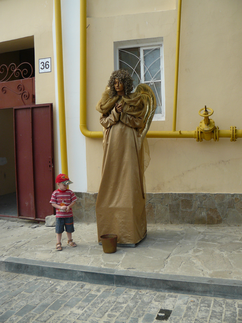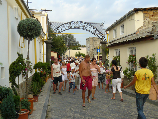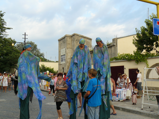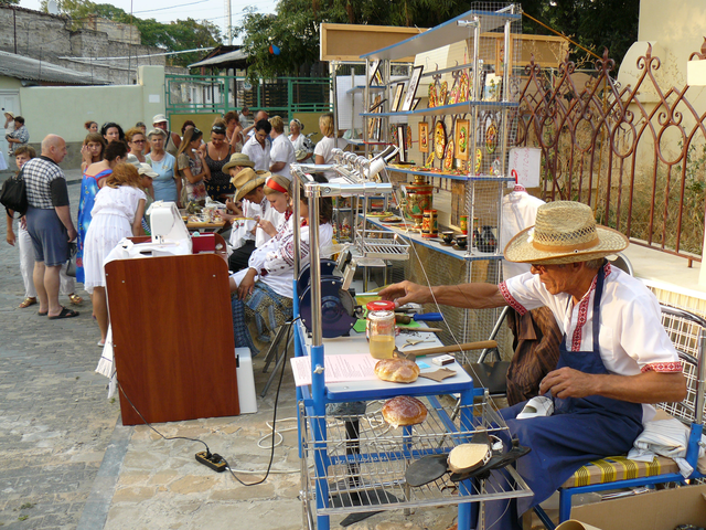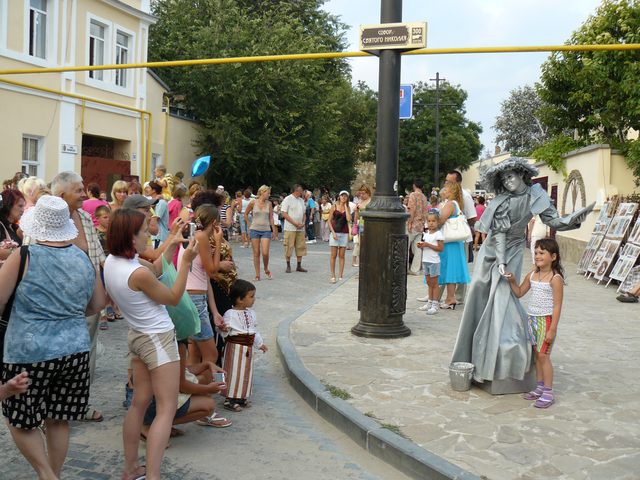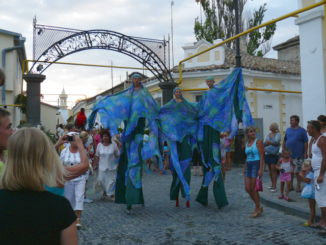 ЕвпаторияВторую жизнь старинным евпаторийским улицам решил придать городской голова Евпатории Андрей Даниленко. По его инициативе вот уже несколько лет ведется реконструкция исторической части города. Но особой популярностью улица Караимская до минувшей пятницы у горожан и курортников не пользовалась. Днем по "Малому Иерусалиму" водили экскурсии, а вечерами многолюдно было только у караимского кафе. И вот, на прошлой неделе по электронной почте в редакции интернет-изданий, газет, радио и телестанций пришли сообщения о том, что в старой части Евпатории в рамках фестиваля «Малый Иерусалим» Евпаторийский горисполком проводит "ЛЕТНИЕ ВЕЧЕРА НА КАРАИМСКОЙ». Программа обещала быть интересной: здесь и экспозиция театра живых скульптур, и процессия великанов из Театра на ходулях, и «Южный вернисаж» - выставка-продажа творческих работ художников и фотографов, и «АРТ-беседка» с романсами и классической музыкой. Пообещали даже "поэтическую площадку" с которой выступил правда только один евпаторийский поэт.