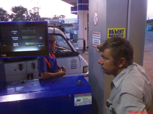 Но дверь это мелочи. Оказывается, автобус выехал в рейс не заправленным горючим. Поэтому битком набитый автобус  заезжает на заправку. В Советское время при таких вынужденных заправках, пассажиров высаживали из автобуса, но это было в СССР, а в европейской державе Украина, автобусы заправляют вместе с пассажирами