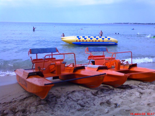 Прямо на пляже можно прокатиться на «банане» или на «тарелке». На «тарелку» надо найти себе спутника, причем с похожим весом (плюс-минус 30 кг), если разница будет больше, есть риск, что тот, кого кормили меньше, просто вылетит в море. По желанию тарелку в море переворачивают. Стоит это удовольствие 70 гривен на двоих.