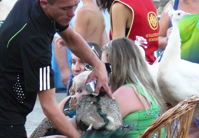 или с дикими птицами  "за 20 гривен на свой фотоаппарат". Этот бизнес в Крыму запрещен, но в Евпатории милиция в упор не замечает полумертвых диких животных в руках у фотографов, считая их ... бутафорией