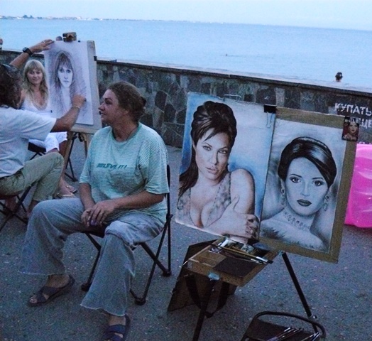 Российские туристы частенько привозят из Евпатории домой свои портреты. Если вы хотите запечатлеть себя в цвете, то за это произведение искусства вам придется выложить 250 гривен, за то же самое, но в черно-белом исполнении - 180