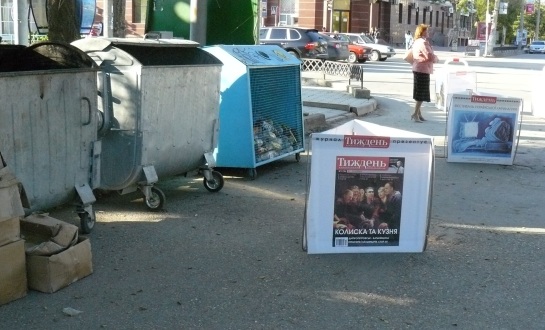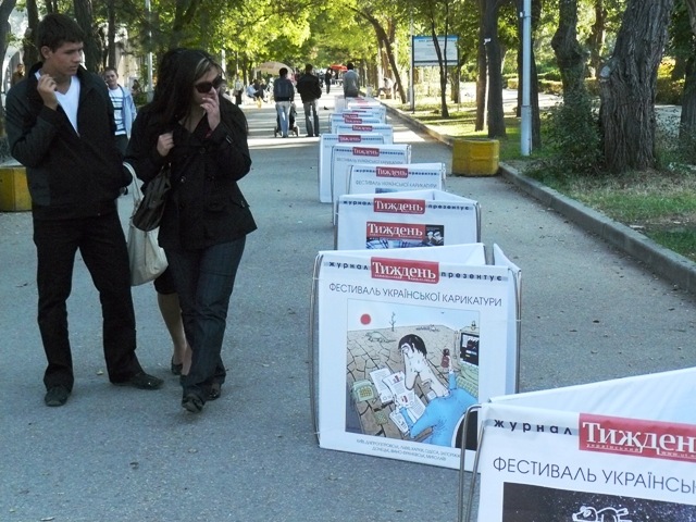 Расположены они на земле на самом проходном месте и даже возле мусоросборников. Но реклама цепляет. Люди рассматривают карикатуры, запоминая название издания.