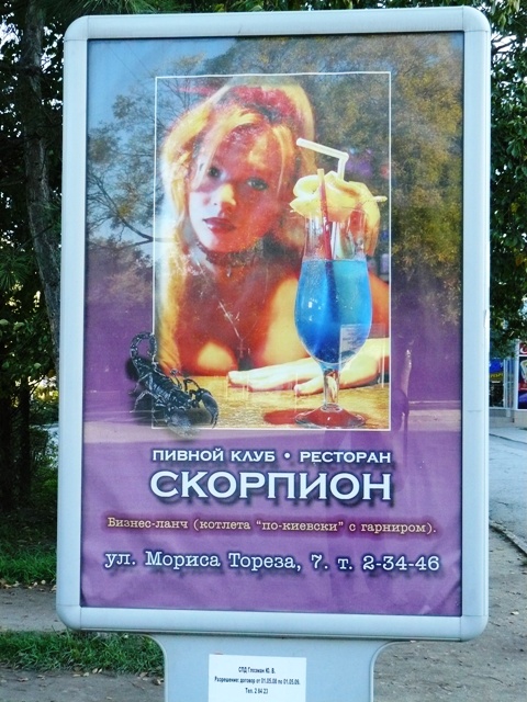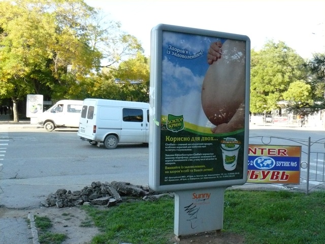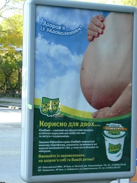 А вот другой пример на той же улице Фрунзе в Евпатории. Авторы рекламы изобразили живот беременной женщины,