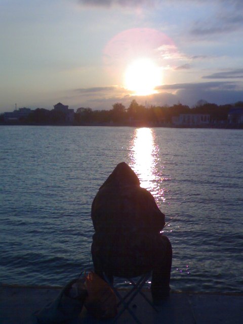Стоило сделать два шага в сторону и фотокамера выдает того же рыбака, совсем другим: на свету и в деталях. Но этот снимок мне не нравится. Сплошной соцреализм.