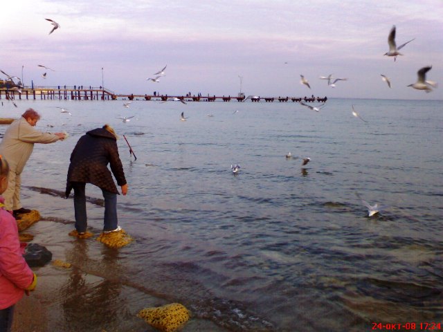 А в это время на берегу, курортники занимаются «кормлением хищников». Они бросают в море хлеб и наблюдают, как за приманкой с высоты кидаются  в море белокрылые голодные чайки.