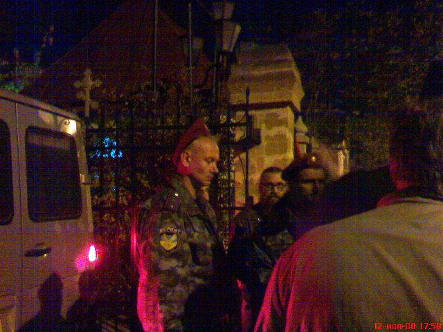 Вначале коммунисты, под руководством заместителя председателя крымского Совмина Юрия Корнилова, готовили "горячий прием" участникам акции возле краеведческого музея Евпатории, где развернута выставка, посвященная голодомору на Украине. Но потом выяснилось, что автомашина с гостями заехала на территорию одного из евпаторийских православных храмов. Коммунисты заблокировали ворота в храм и в течение двух часов не выпускали автомобиль за его территорию. Все это время местный священник пытался поставить на путь истинный пикетчиков. Он говорил, что ничего не нарушил, впустив автомобиль пришельцев во двор храма, а на проповеди был политкорректен, поминая всех усопших от голода, а не только украинцев. Но убедить в своей правоте служитель культа коммунистов – атеистов так и не смог. В его благие намерения никто не верил. Священника обвиняли в том, что он занялся политикой и поддерживает своими проповедями «оранжевых раскольников». После двухчасовых дебатов коммунистов и священника, милиция, получив приказ, расшвыряла стариков у ворот, и вызволила из плена автомобиль со свечами. Одна из пострадавших, женщина преклонных лет, пожаловалась корреспонденту "Крымского аналитика" на грубость милиции. - Милиционер меня воротами ударил и за руки больно хватал.