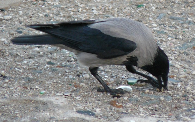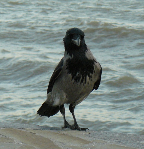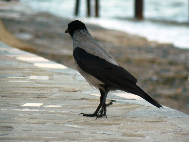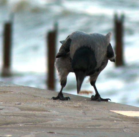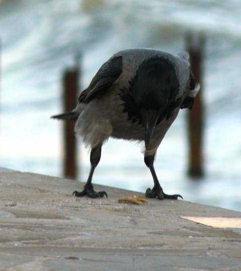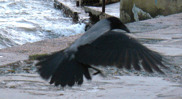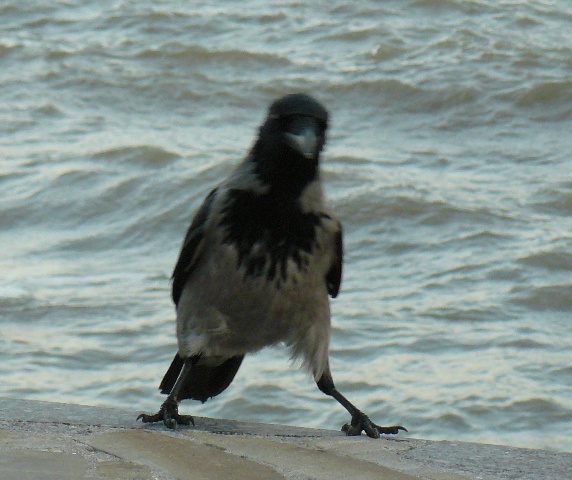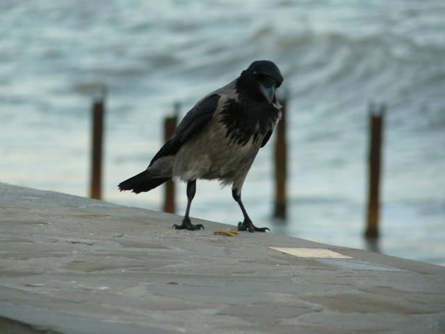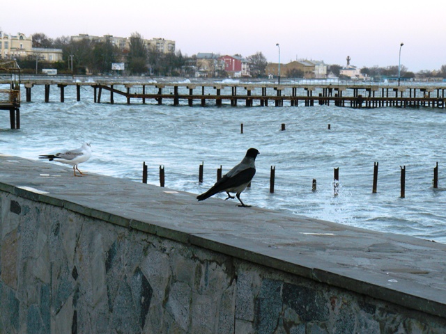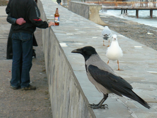 Серая ворона ЕвпаторияЭто была самая необычная фотосессия. С моря дул штормовой ветер, а на берегу голодные чайки выпрашивали хлеб у евпаторийцев. И вдруг со стороны залива послышалось "Карр" и тут же на невысокий парапет набережной, в двух шагах от крымского парацци, приземлилась большая серая ворона. Она важно ходила между чайками, и смешно пританцовывая, клевала хлеб. Людей серая ворона  совсем не боялась, а когда защелкал фотоапаарат, птица, подражая фотомоделям, показала себя во всей красе, делая танцевальные  вороньи ПА. При штормовом ветре, ей удавалось даже демонстрировать стойку на одной ноге. Немногочисленные зрители, присутствовавшие при сольном выступлении серой вороны, утверждали, что она "ручная" и раньше жила у кого-то в доме, а потом, покинув хозяев, прибилась к морским чайкам, с которыми не конфликтует, а  зовут ее здесь просто, Евпаторийская ворона. Так это или нет, доподлинно неизвестно, но для того, чтобы читатели "Крымского аналитика" пополнили свои знания в вороноведении, публикуем небольшую справку о серых воронах из Википедии. "Серая ворона. Серая с черной головой, крыльями и хвостом.  Издает хриплое “карр” и другие звуки. Местообитания. Предпочтение отдает городам, населенным пунктам. Питание. Всеядна. Эти сообразительные птицы пpeкрасно приспособились к соседству человека. В последние годы они, например, научились систематически проверять вывешенные зимой за окно сумки с продуктами. Умеют поднимать крыши скворечников, если они не прикручены проволокой.