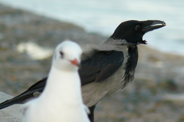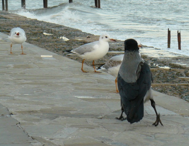 Фото. В Евпатории к чайкам примкнула "ручная" Евпаторийская серая ворона |