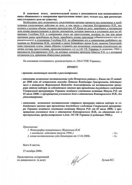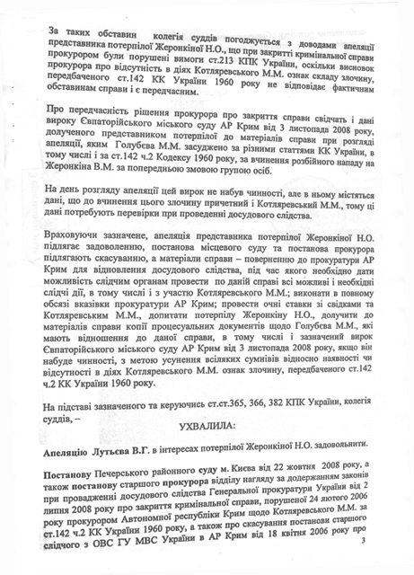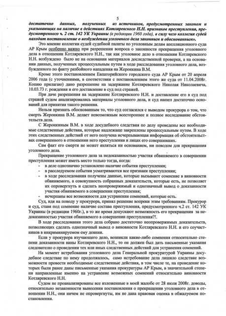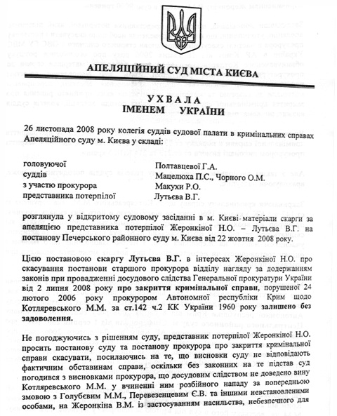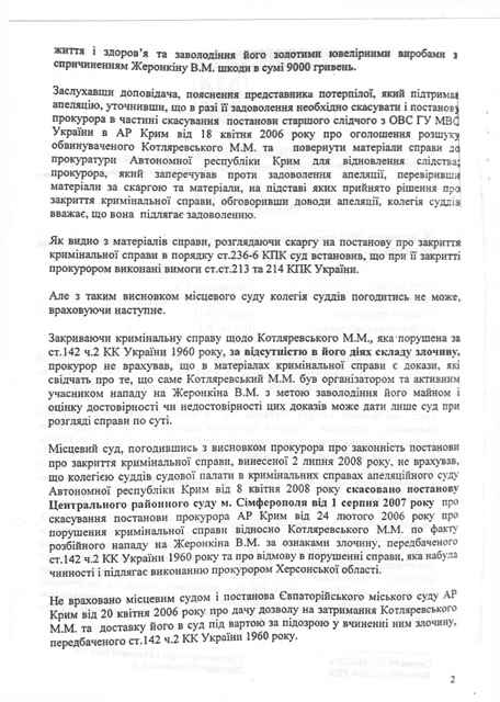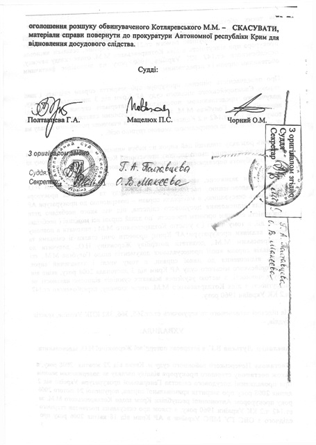 Апелляционный суд города Киева также отменил Постановления старшего следователя ОВС ГУ МВС Украины в АР Крым от 18 апреля 2006 года об объявлении розыска обвиняемого Котляревского Н.Н. и направил материалы уголовного дела в отношении Котляревского Н.Н. в прокуратуру АРК для возобновления досудебного следствия. УБОП ГУ МВД Украины в АР Крым просит всех граждан, кому что-либо известно о местонахождении Николая Котляревского сообщить по телефону 8-(0652) – 54-70-30 (круглосуточно). На фото: Николай Котляревский Фото: http://www.prima-news.ru/news/news/2002/11/12/21524.html