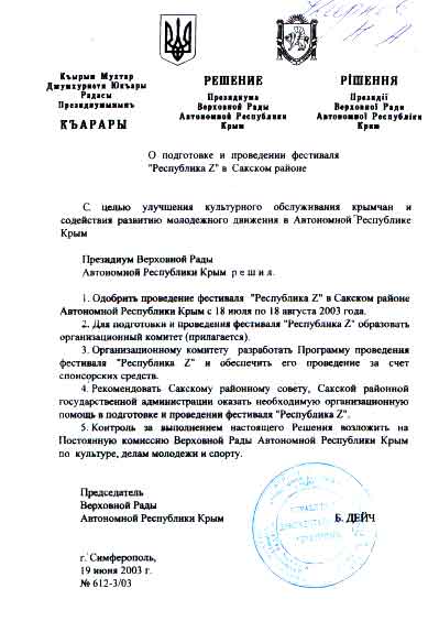 Решение Президиума ВР АРК "О подготовке и проведении фестиваля "Республика Z" в Сакском районе"