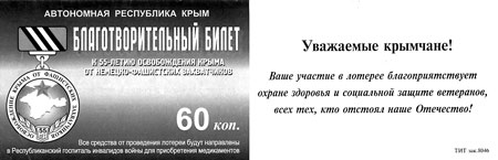 Переворачиваю билетик и читаю: «Автономная Республика Крым. Благотворительный билет к 55-летию освобождения Крыма от немецко-фашистских захватчиков. Цена — 60 коп». А внизу приписка мелким шрифтом: «Все средства от проведения лотереи будут направлены в Республиканский госпиталь инвалидов войны для приобретения медикаментов».
